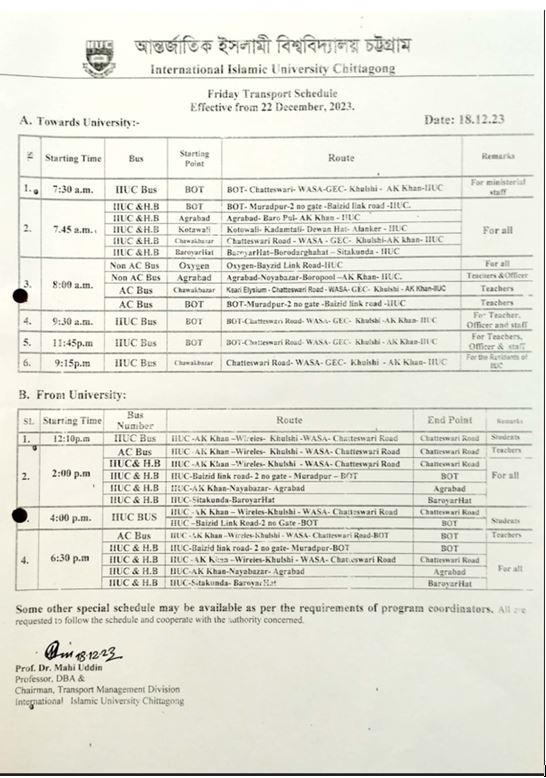 Transport Schedule for Officers and Staff effective from 28th December, 2024